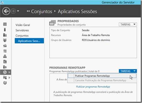 1) Acesse o Gerenciador do Servidor > Selecione Serviços da Área de Trabalho Remota > clique no Conjunto de Sessões criado >Em Programas RemoteApp clique em Tarefas > selecione Publicar Programas RemoteApp.