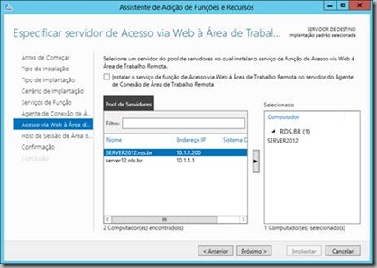 10) Selecione o servidor que será o servidor de Acesso via Web à Área de Trabalho Remota, no caso o seu segundo servidor nesse nosso exemplo > Próximo