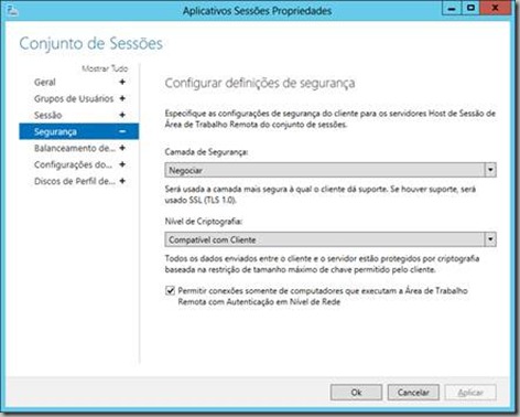 6) Na Guia Segurança podemos definir a camada de Segurança e o nível de criptografia ser utilizada pelas conexões ao servidor da Área de Trabalho Remota.