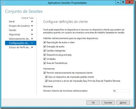 8) Em Configurações do Cliente podemos habilitar alguns dispositivos que serão redirecionados ao usuário que se conectar ao servidor. Vamos exemplificar, imaginando que cada usuário no seu desktop possui caixa de som, webcam, impressora e deseja ao realizar uma conexão remota ao Servidor da Área de Trabalho Remota tenha acesso a todos esses dispositivos mesmo que seja remotamente.