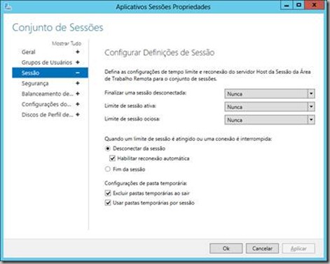 Limite da sessão ativa: Esta opção define o tempo de utilização para cada sessão. Definimos em nosso exemplo a opção nunca.