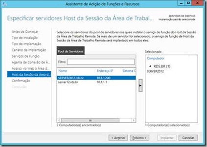 11) Selecione o servidor que será o servidor Host de Sessão da Área de Trabalho Remota, no caso o seu segundo servidor nesse nosso exemplo > Próximo