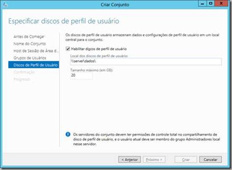 6) Especifique o local onde deseja salvar os perfis de cada usuário. Este local pode ser em outro disco ou em outro servidor. Determine ainda o tamanho máximo de armazenamento para cada perfil > Clique em Próximo.